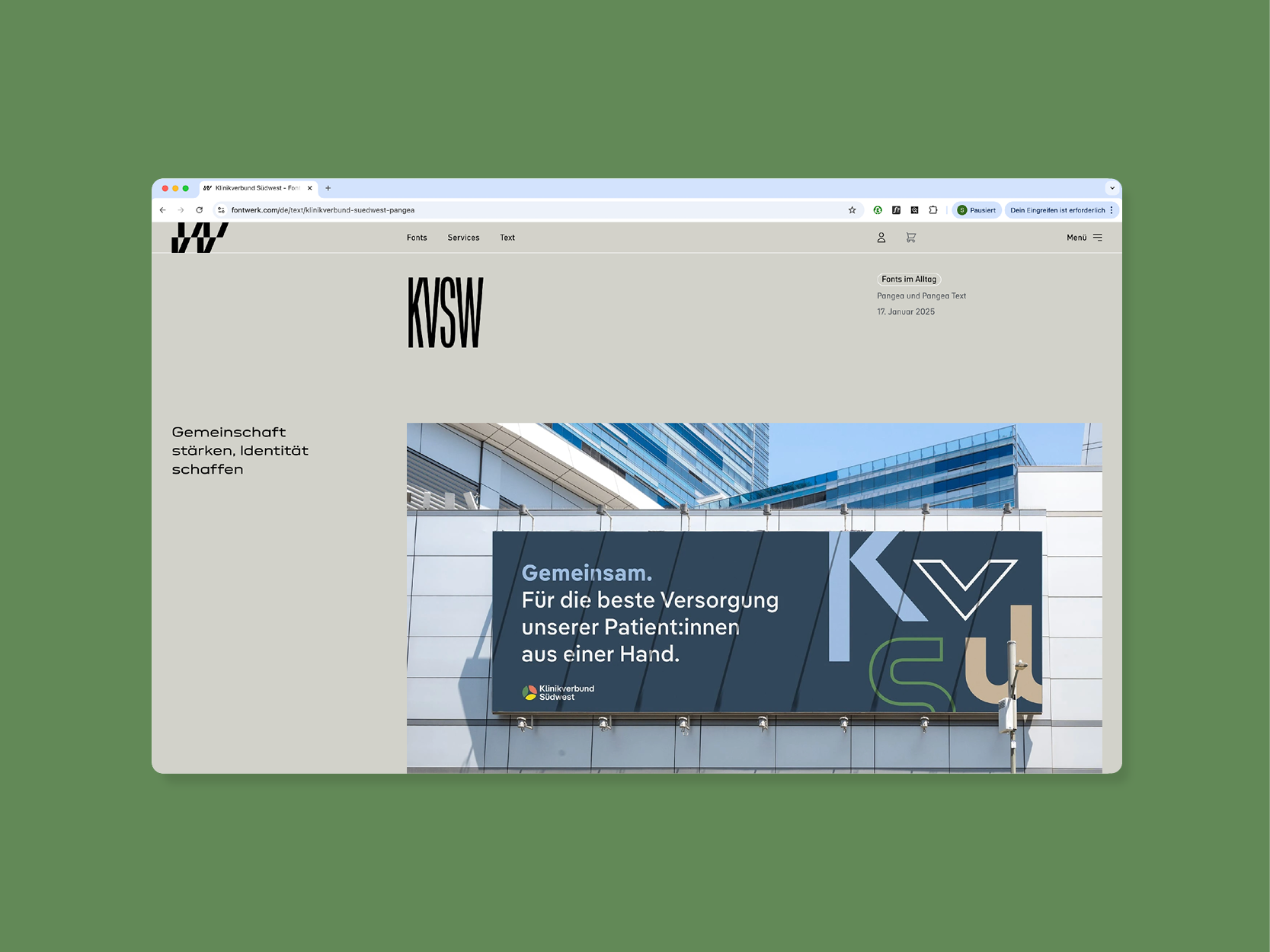 Vor einiger Zeit bekamen wir das freundliche Angebot von Geschäftsführer Ivo Gabrowitsch, unser Branding für den Klinikverbund Südwest auf Fontwerk präsentieren zu dürfen. Tollerweise war hier genügend Raum, um den Einsatz des Corporate Designs vor Ort zeigen und eigens geshootete Assets unterzubringen. Bei einem vergangenen Besuch im schönen Schwabenland konnten wir diese vor Ort ablichten und mit einem Kennenlernen des neuen UK-Teams verbinden. Riesig gefreut hat uns das Fazit unserer langjährigen Ansprechpartnerin Tiziana Schuster, ehemalige Leiterin der Stabsstelle Unternehmenskommunikation: